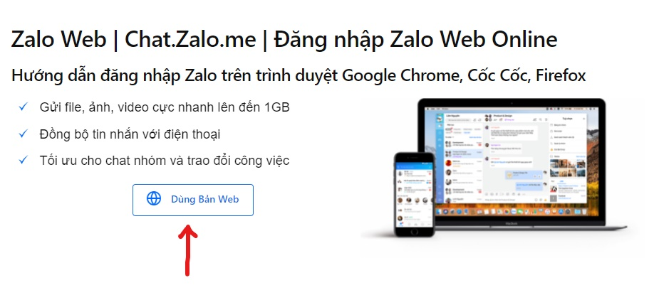 Đầu tiên, truy cập vào Zalo Web, sau đó chọn Dùng Bản Web như hình.