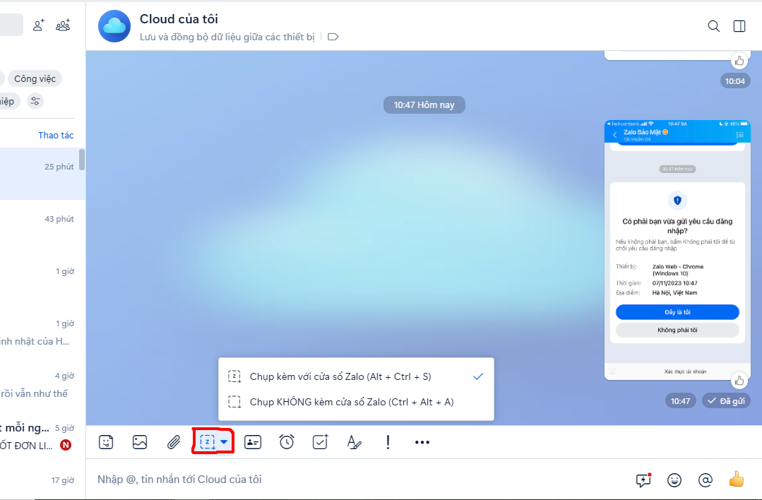 Ctrl + Alt + S: Chụp kèm với cửa sổ Zalo.