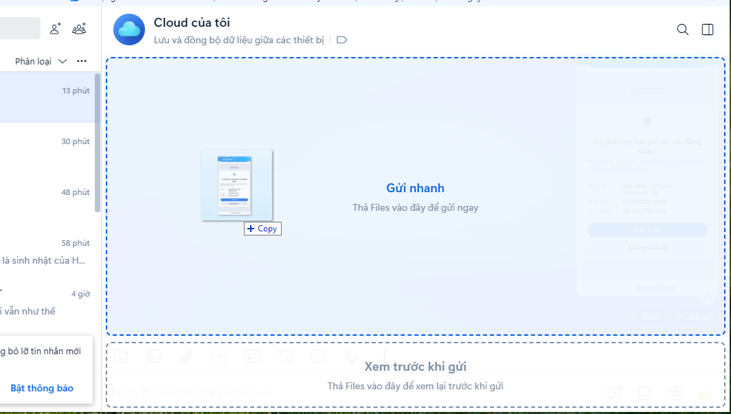 Bạn cũng có thể xem trước khi gửi bằng cách đưa file xuống khung chat ở phía dưới.