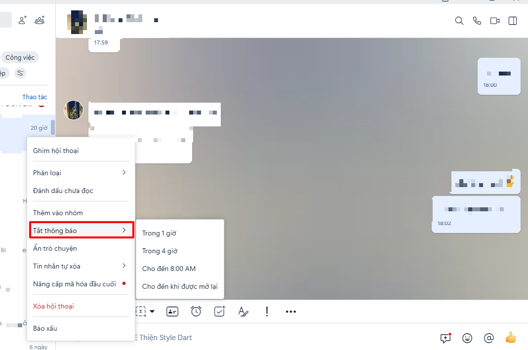 Bạn kích chuột phải vào cuộc trò chuyện muốn tắt thông báo > Tắt thông báo > Chọn loại thời gian mà bạn muốn tắt, ở đây người dùng có thể tắt đi trong 1 khoảng thời gian hoặc tắt đến lúc được bật lại tùy vào mục đích