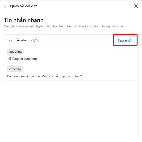 Sau khi ấn vào quản lý, bạn có thể thiết lập những tin nhắn ngắn gọn bằng cách ấn vào Tạo mới để viết tắt cho các cụm từ dài.