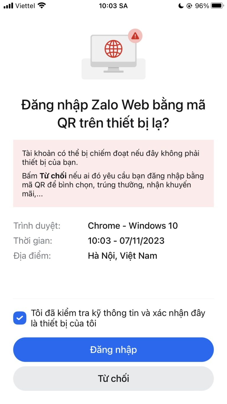 Sau khi tích vào ô “Tôi đã kiểm tra kỹ thông tin và xác nhận đây là thiết bị của tôi“, ấn vào “Đăng nhập” để hoàn tất.